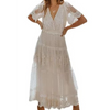 Step into effortless elegance with this lace midi dress — the perfect blend of romance and versatility. Designed in a soft ivory hue, it features a flattering V-neckline, airy sheer sleeves, and intricate lace details that add a timeless charm. The cinched waist creates a feminine silhouette, while the flowing tiered skirt moves gracefully with every step.
