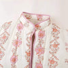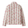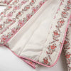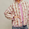 This quilted floral jacket brings a charming, cottage core-meets-coquette feel with its soft pink tones and vintage-inspired blossom print. The exterior features delicate vertical floral panels trimmed with pink piping that adds a sweet, polished finish. Inside, the smooth padded lining gives it a lightweight, comfy warmth—perfect for layering without feeling bulky. The open-front silhouette and roomy patch pockets make it an easy throw-on piece for everyday outfits, adding a gentle pop of color and romance to any look.