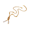 Elevate your look with this bold yet elegant 18K gold-plated necklace, crafted from durable stainless steel for long-lasting shine. Featuring a unique double-chain lariat style.  Accented with sleek gold beads and finishes in a stylish knot drop. Each end is adorned with Czech rhinestone-encrusted bars, adding a dazzling contrast of sparkle and texture. This versatile piece blends modern sophistication with timeless glam, perfect for statement layering or wearing solo.