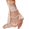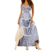 Romantic tiered maxi dresses are a dreamy blend of vintage charm and boho flair. Crafted from a soft cotton-polyester mix, they feature a flattering ruched bodice with a deep V neckline and dainty spaghetti straps. The skirt cascades in playful layers of mixed floral prints, edged with delicate lace trim that adds texture and whimsy. Perfect for sunny strolls, weekend getaways, or countryside weddings, these dresses bring effortless elegance with a sweet, nostalgic vibe.
