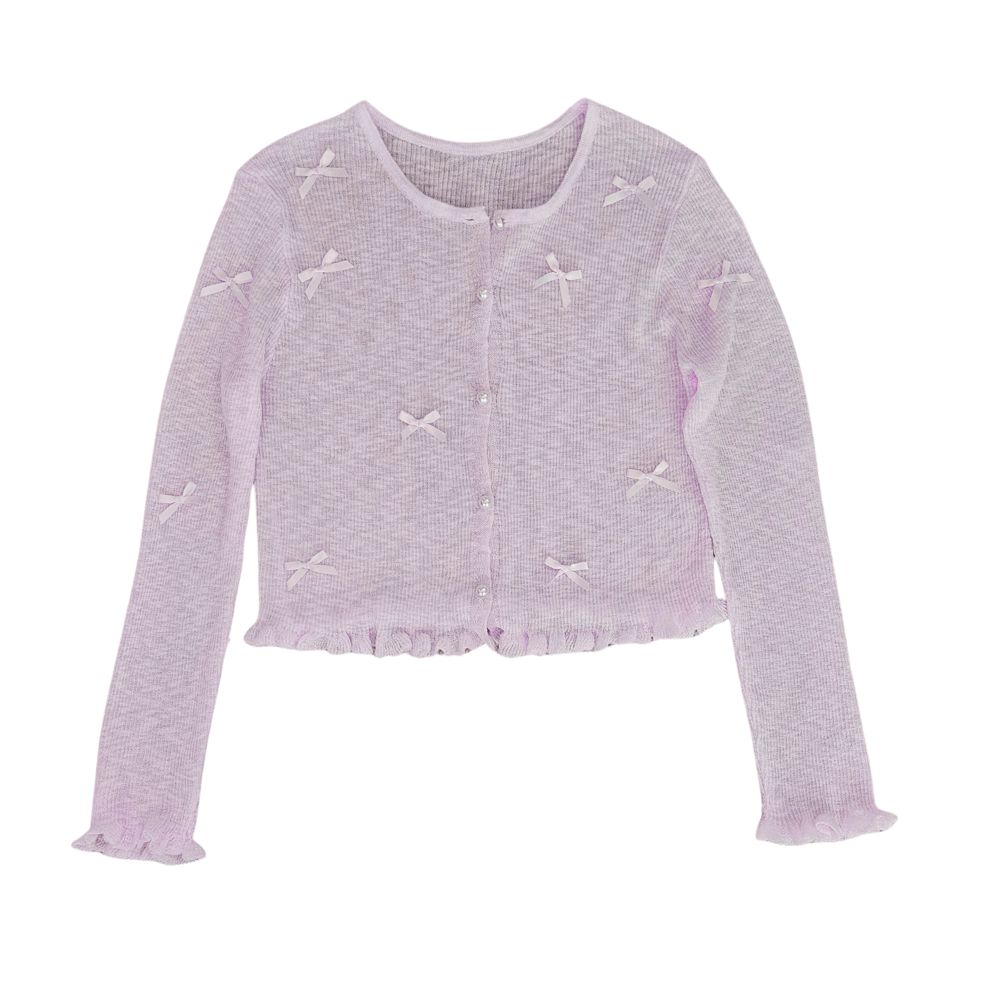This ultra-lightweight cardigan is the perfect layering piece for breezy days and cool evenings. It features delicate bow appliqués scattered across the front for a sweet, feminine charm. The round neckline, button-down closure with pearl buttons and subtle ruffled hem and cuffs add a playful yet elegant touch. Effortlessly versatile, it can be worn over dresses, camis, or paired with jeans for a chic everyday look.
