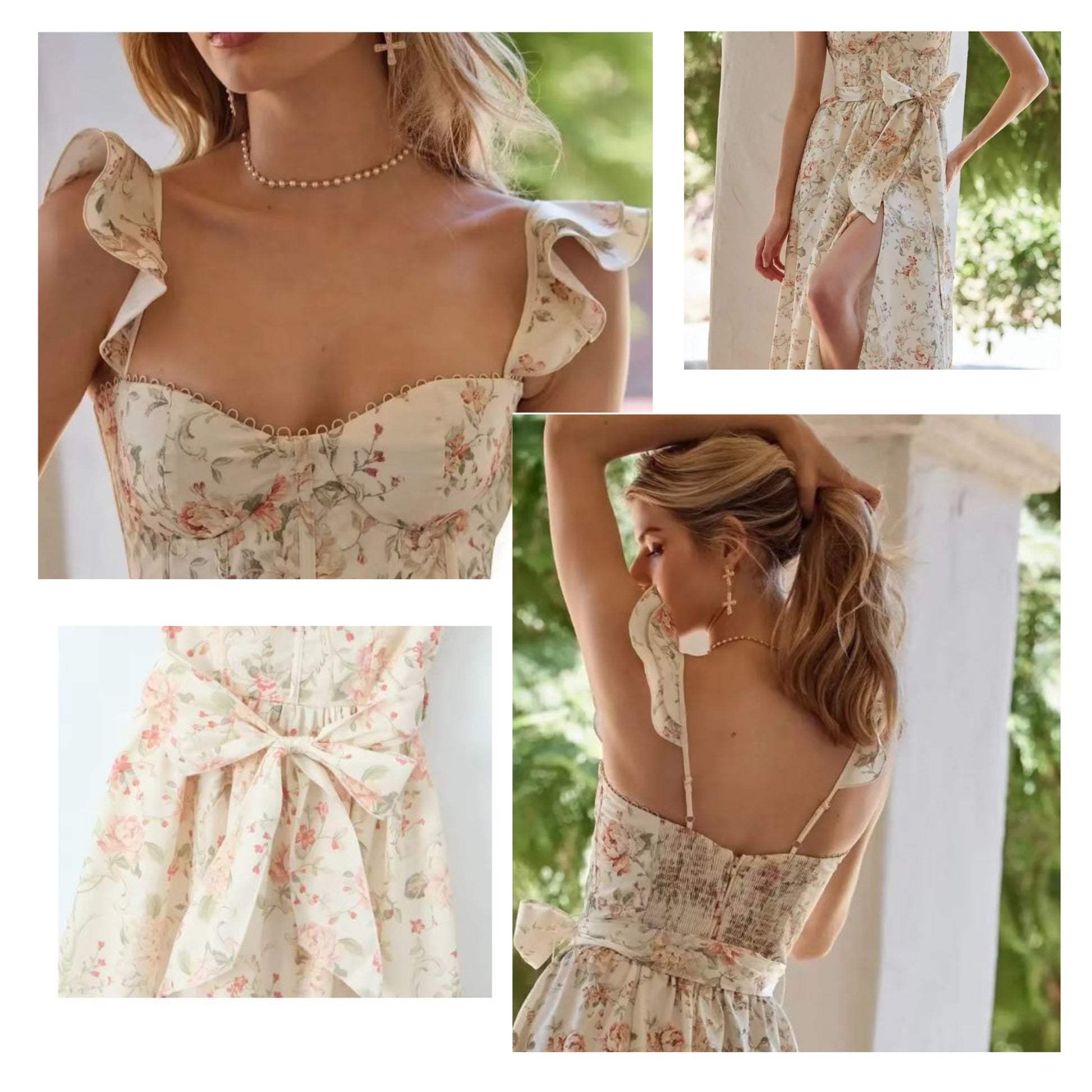 This beautiful summer dress is a romantic and feminine piece, perfect for any event—from garden parties to outdoor weddings. Crafted from a light, breathable fabric with a charming floral print, it features ruffled shoulder straps, a flattering sweetheart neckline, and a cinched waist tied with a soft bow for added elegance. The high slit adds a touch of allure while keeping it effortlessly breezy and comfortable. Whether you're dressing up for a daytime celebration or a sunset soirée, this dress brings timeless charm and graceful movement to every moment.