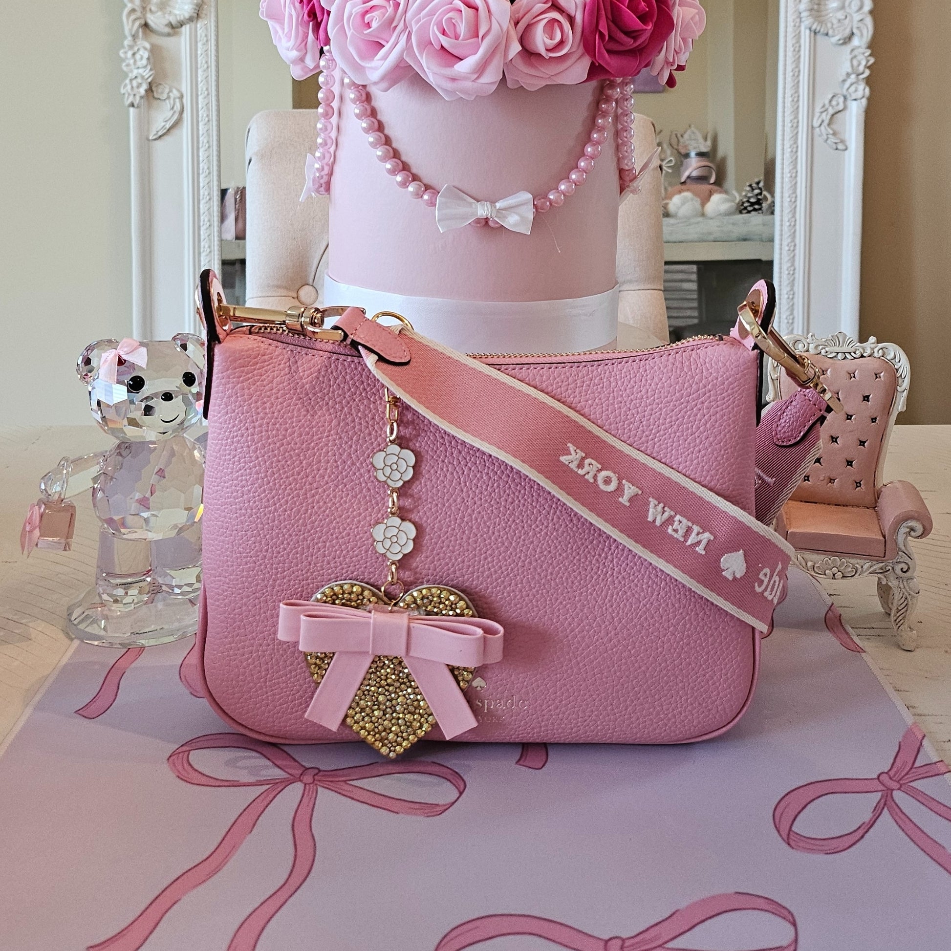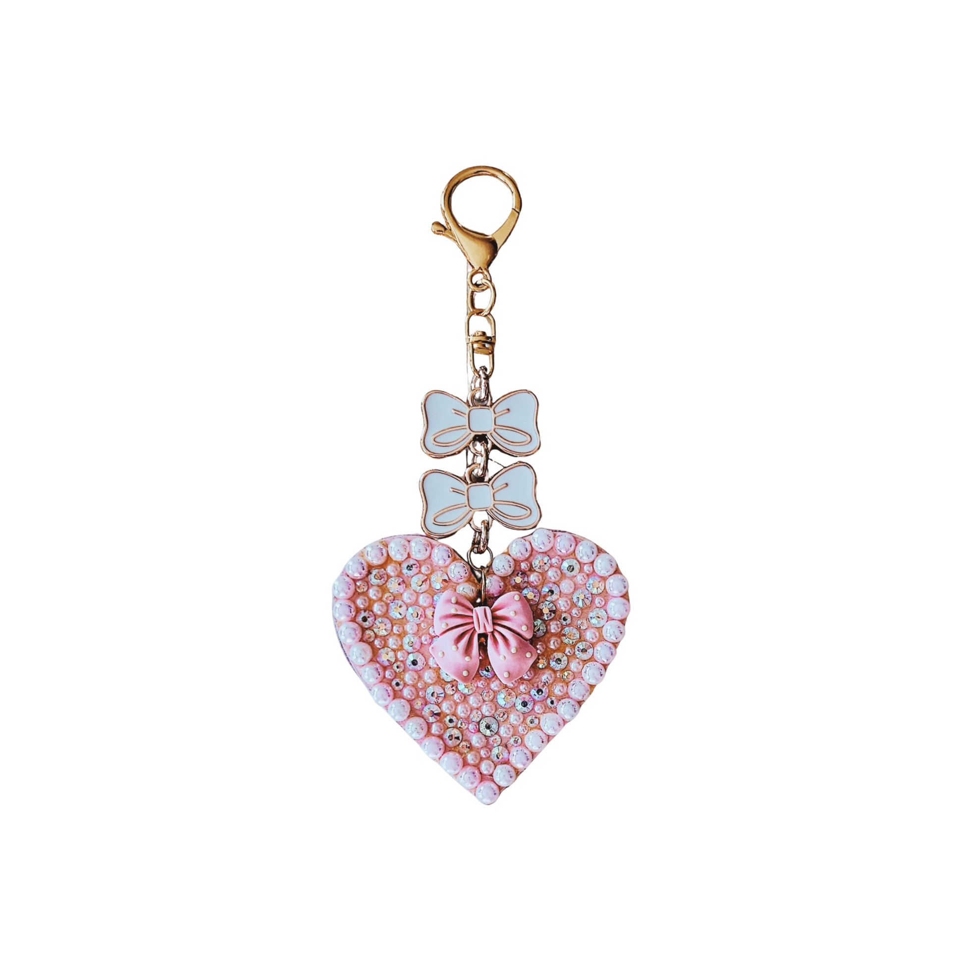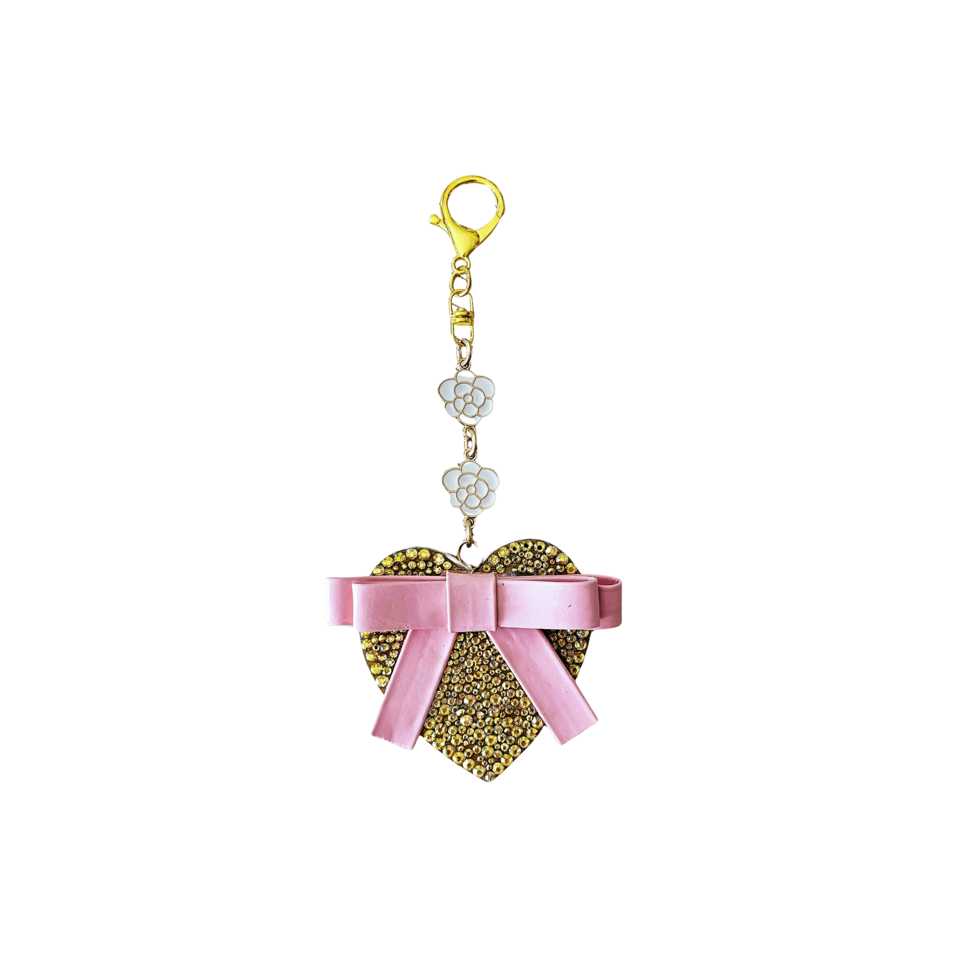 Demure, coquette heart bag charms designed with sparkling rhinestones, lustrous pearls and or beads creating a perfect blend of elegance and charm. Each piece is a little treasure designed to add a touch of luxury to your favorite bag. The stainless steel hardware is beautifully crafted with bows or flowers for a touch of sophistication and lasting quality. Base is made of wood or acrylic and then covered with faux leather.