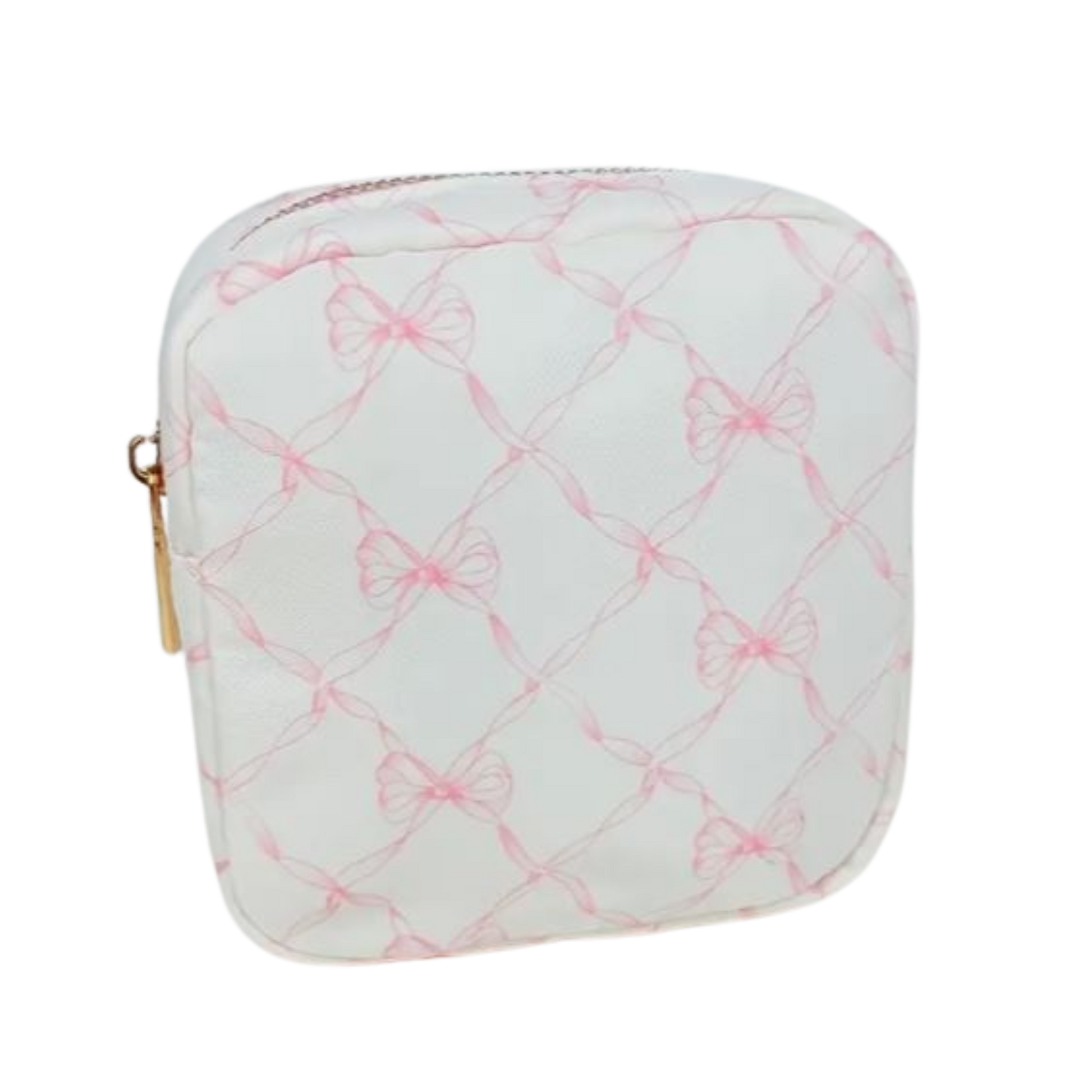 Keep your glam tidy in this coquette organizer. Lightweight and sized for your everyday edit—brushes, compacts, lippies, and skincare minis. White case wrapped in a blush bow lattice; sleek square profile that slips into any tote.