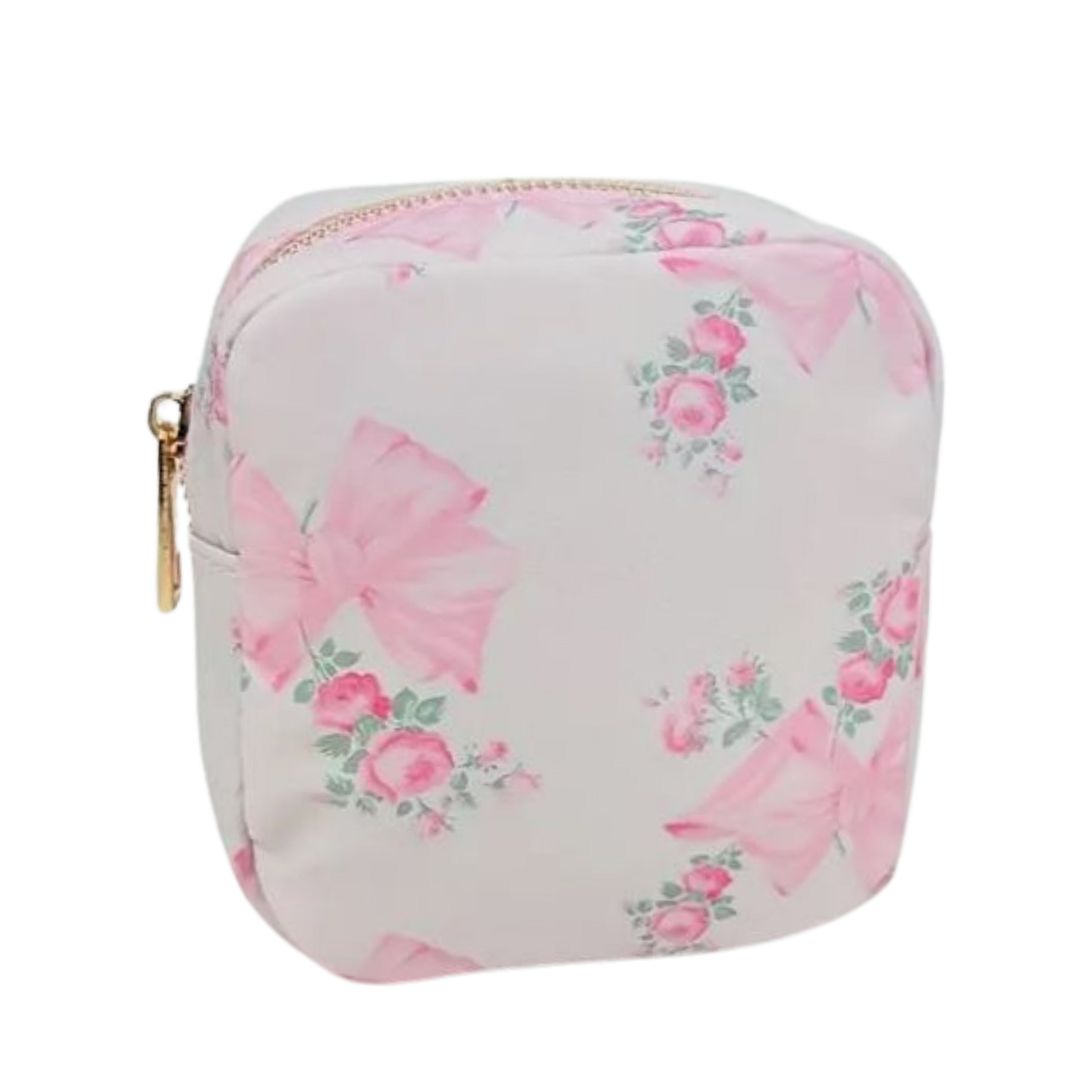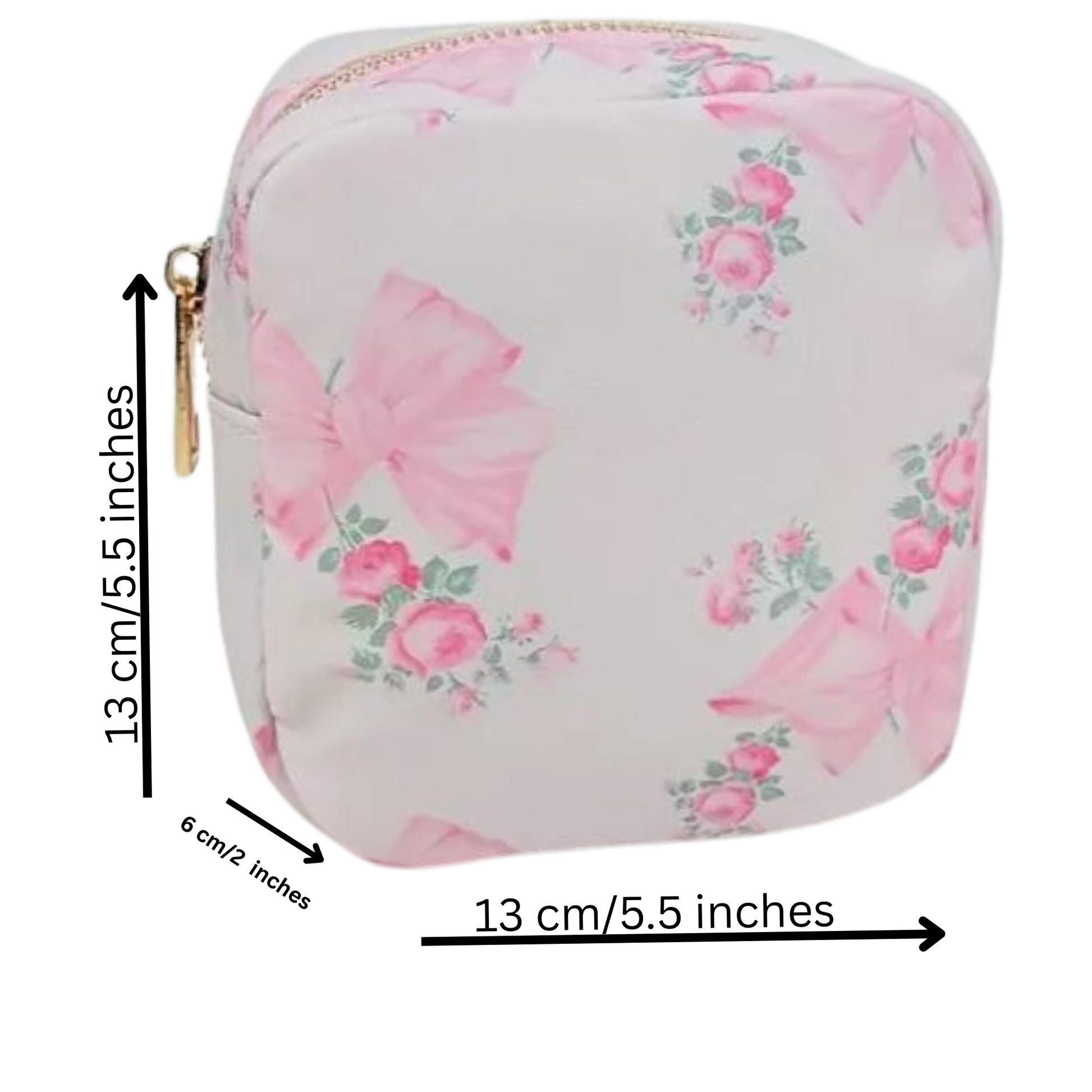Glam, pretty and organized. Designed with scattered powder-blue or pink bows and pink roses; gold zip, softly structured. Ultra-light, easy to wipe, proportioned for brushes, compacts, lipsticks, and travel-size skincare.