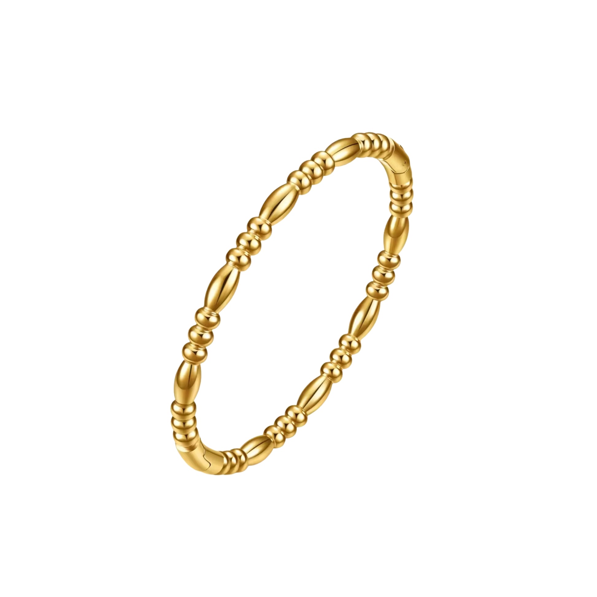 From our Serenity bangles collection - the elegant and sculptural, Spindle and Classic Beaded Bangles! Both bring a touch of timeless elegance to your jewelry collection. Its uniform alternating spindle-shaped and rounded beads design creates a smooth and graceful silhouette that complements any outfit. Crafted from 18K gold plated high-quality stainless steel, it offers a beautiful polished shine that lasts.