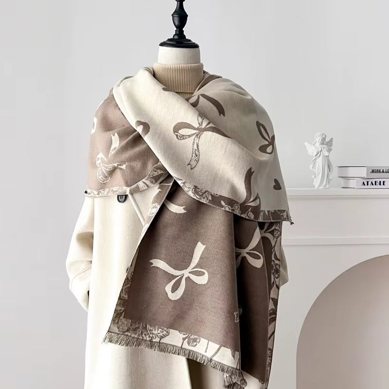 The Heart-Kissed Bow Wrap brings a soft, romantic feel to your everyday layers. Made from high-quality cotton, it has a smooth, cozy texture that sits comfortably on the skin. The oversized design lets it fall gracefully over coats, sweaters, and dresses, giving you an easy, polished look. Its heart and bow pattern adds a charming touch, and the reversible finish offers simple styling options. Warm, beautiful, and effortless to wear, it’s the wrap you’ll reach for all season long.