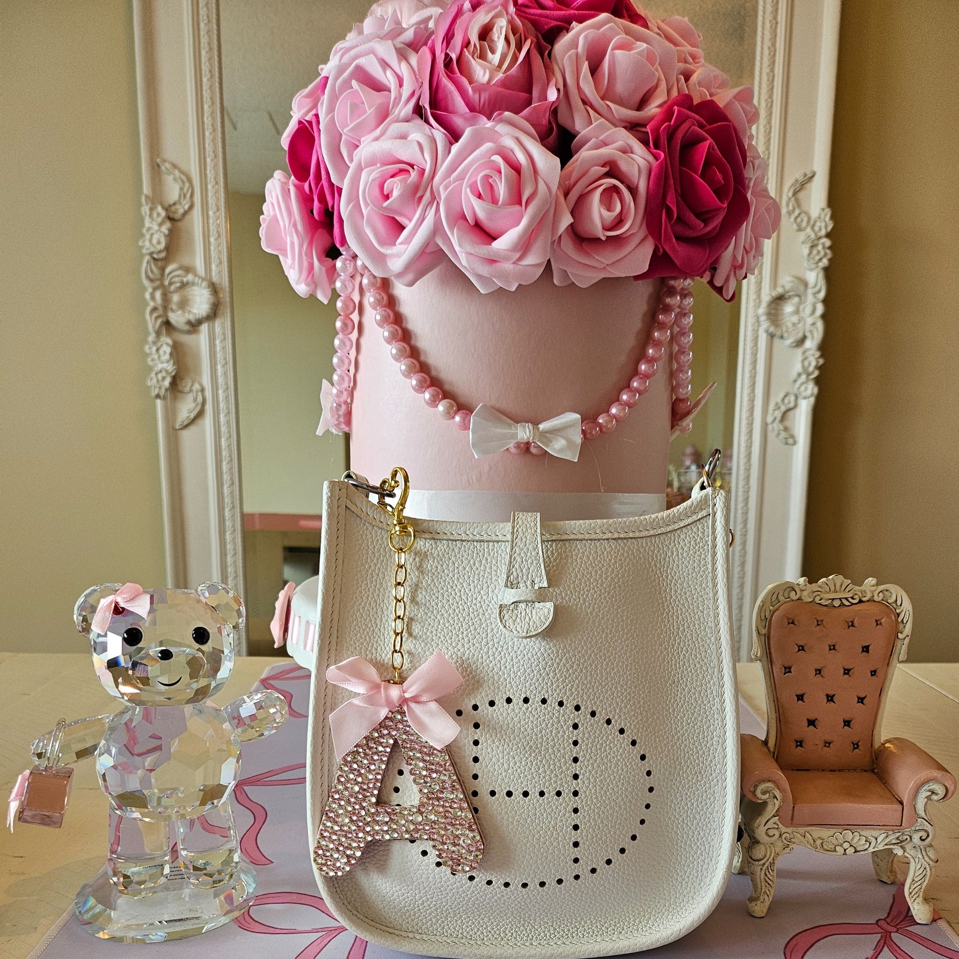 A lovely and personable charm designed with high quality glass rhinestones or faux pearls. Stainless steel and 18k gold plated heart on chain and clasp. Wood base covered with faux leather.