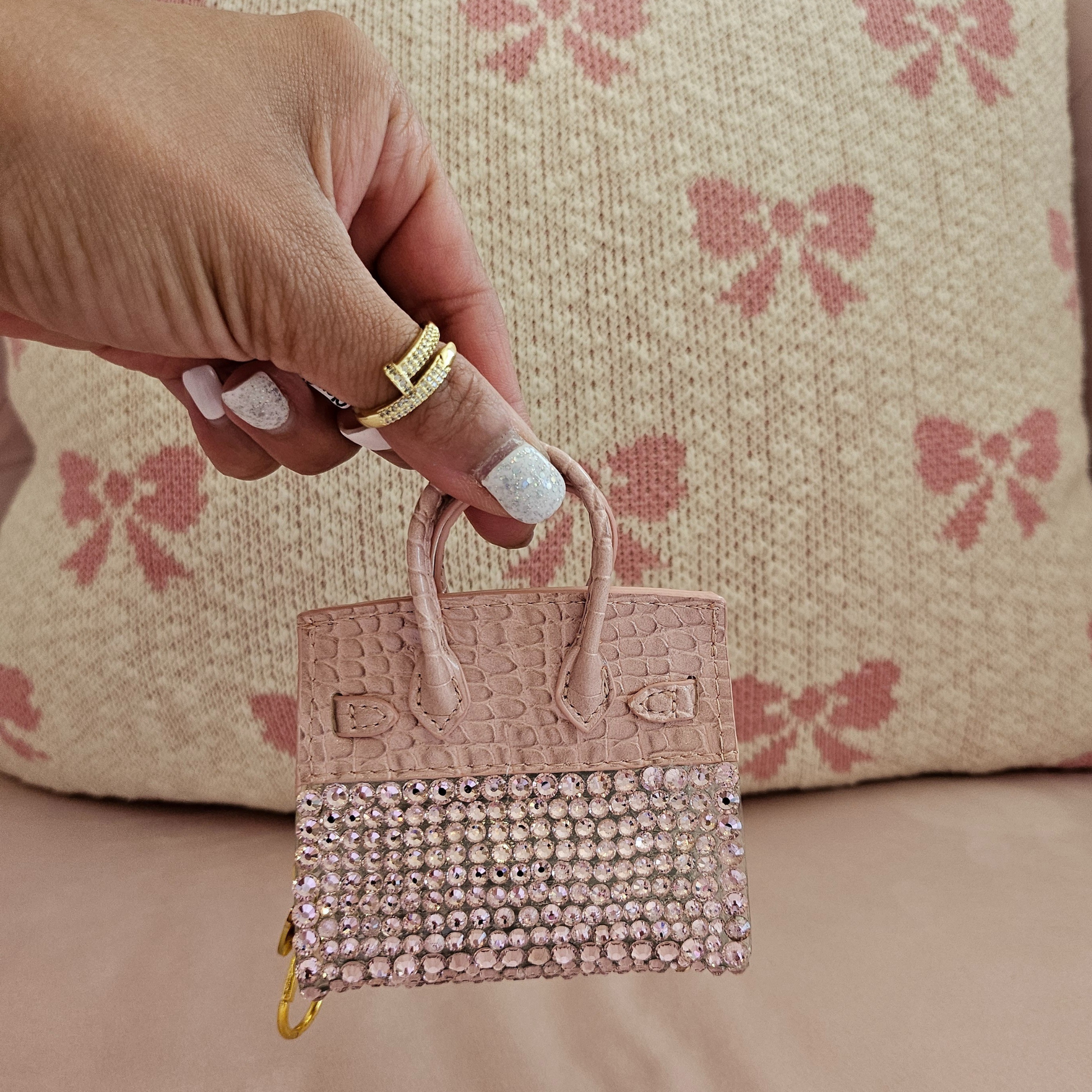 Add a playful pop of luxury to your accessories with this mini Birkin-inspired bag charm. Crafted with exquisite detail, this miniature charm comes in a variety of vibrant colors and is available in both classic smooth finishes and dazzling rhinestone-encrusted designs. Perfect for clipping onto your handbag, keys, or backpack, it’s a stylish way to showcase your love for iconic fashion in a petite, eye-catching form.