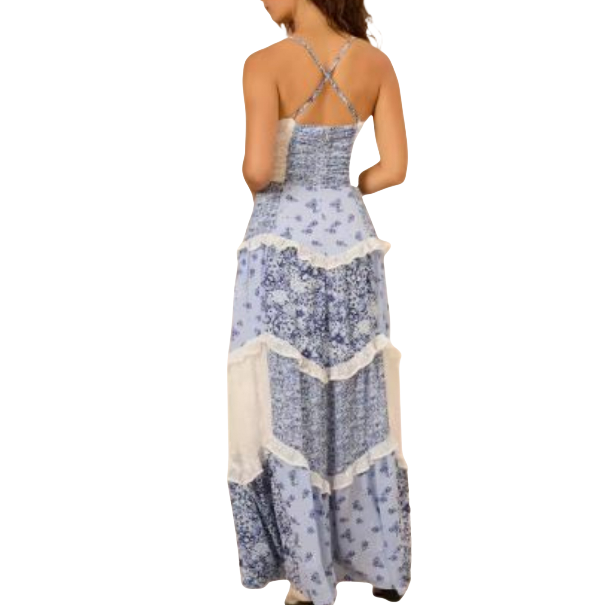 Romantic tiered maxi dresses are a dreamy blend of vintage charm and boho flair. Crafted from a soft cotton-polyester mix, they feature a flattering ruched bodice with a deep V neckline and dainty spaghetti straps. The skirt cascades in playful layers of mixed floral prints, edged with delicate lace trim that adds texture and whimsy. Perfect for sunny strolls, weekend getaways, or countryside weddings, these dresses bring effortless elegance with a sweet, nostalgic vibe.