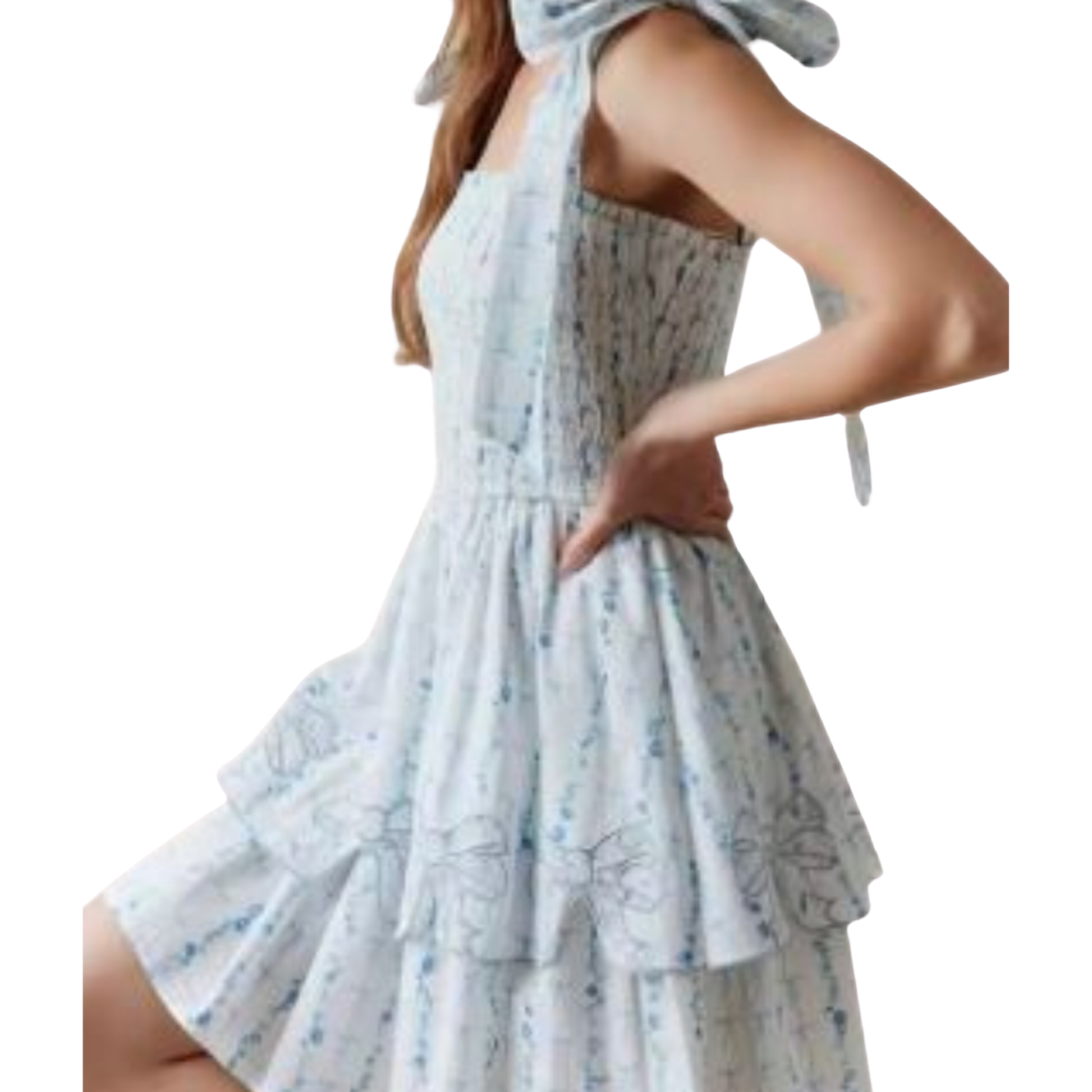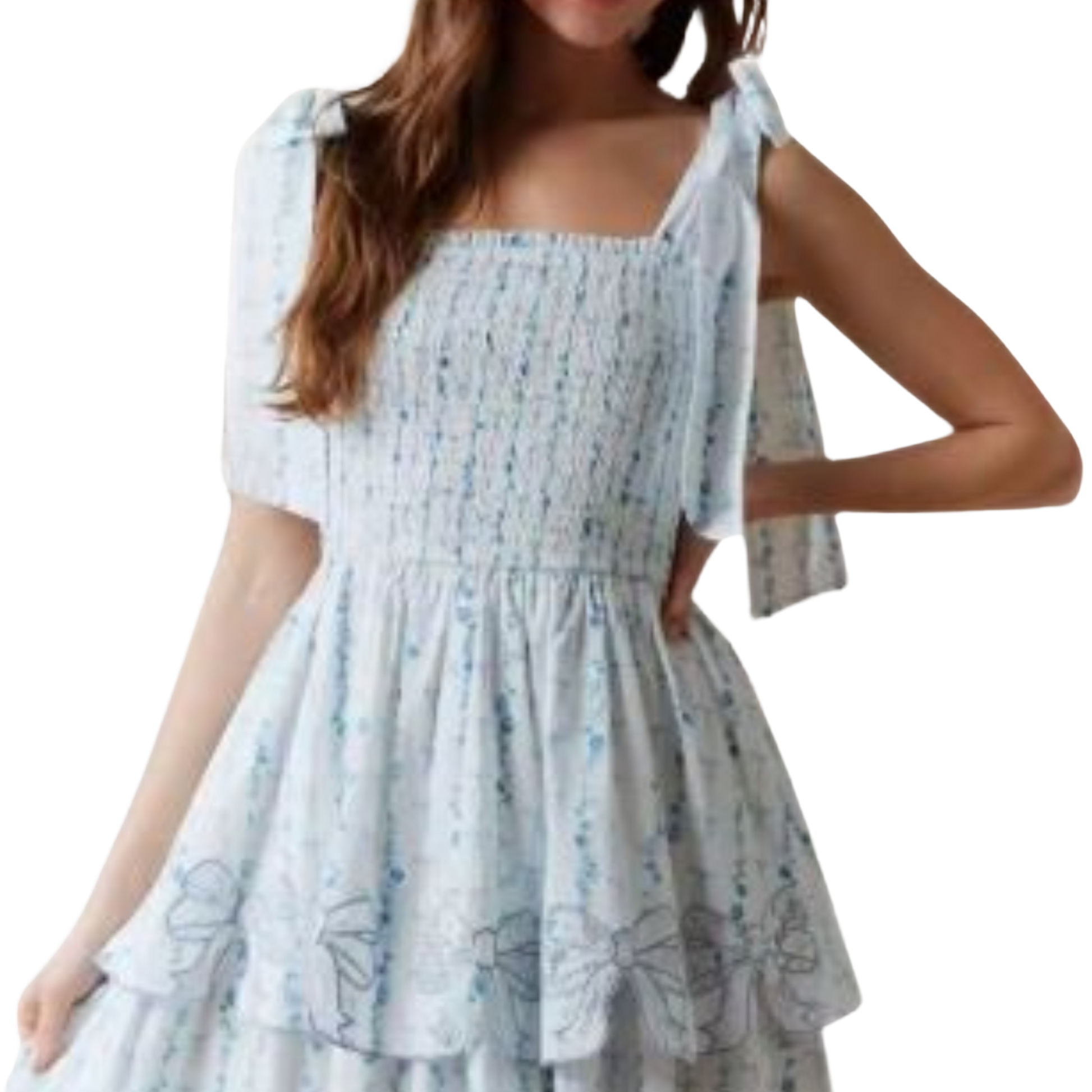 Delicate, flirty, and full of charm — the Rosalie Ribbons Mini is a summertime dream. Made from a breezy cotton-blend fabric adorned with dainty floral prints and embroidered bows. This mini dress features oversized shoulder ties that cascade down the arms.