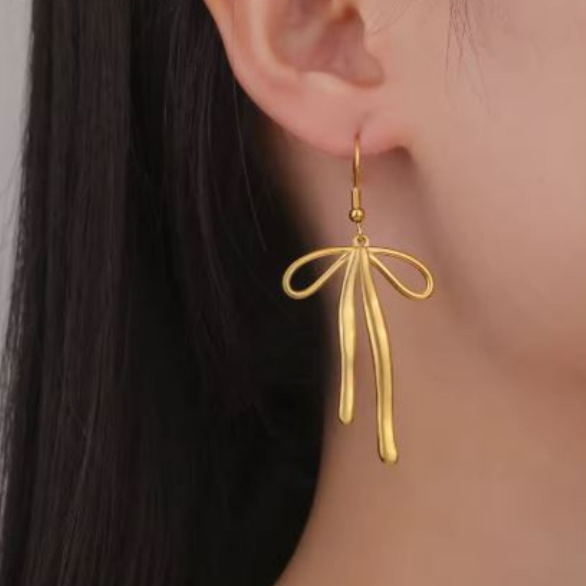 Embrace the coquette aesthetic with these Long Bowknot Pendant Drop Earrings, designed with a blend of romantic charm and effortless sophistication. Crafted from high-quality stainless steel with a radiant 18K gold-plated finish, these earrings feature a delicate bow-tie design, symbolizing femininity and grace. Hypoallergenic and tarnish-resistant for lasting shine.