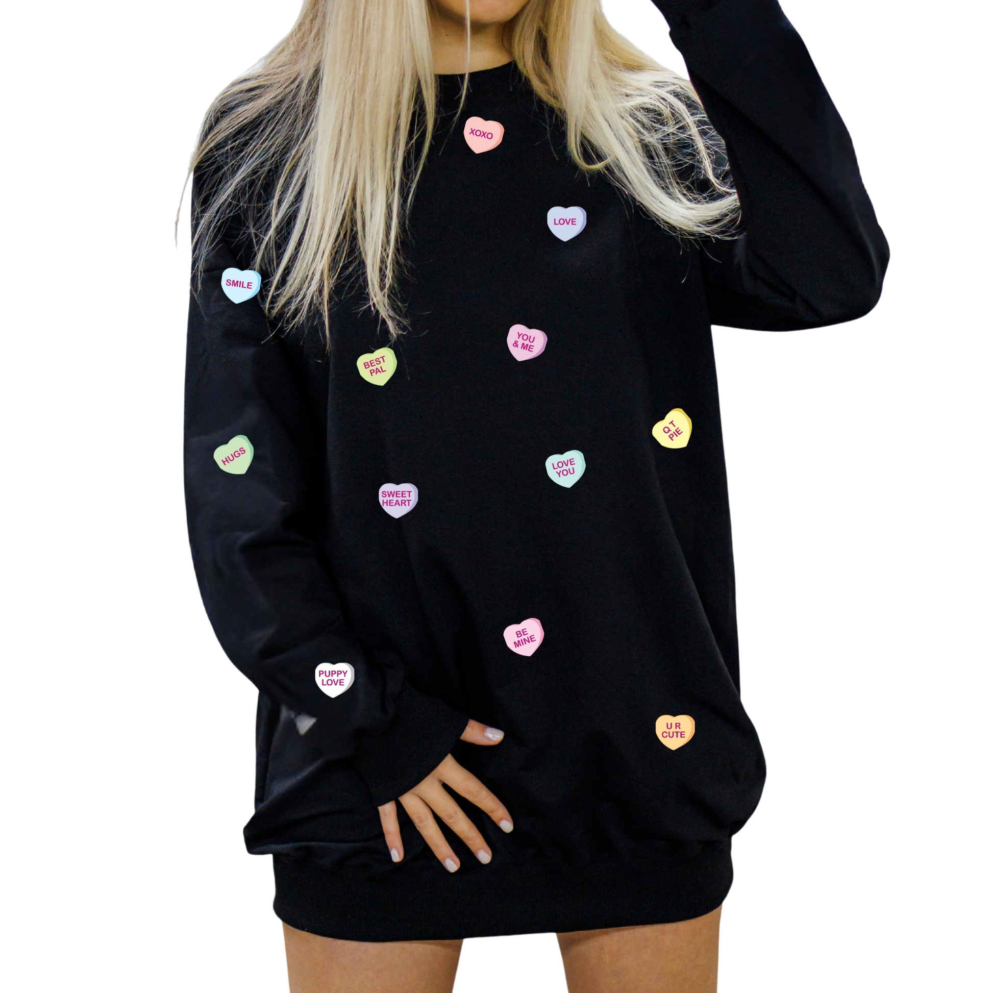 I wanted something playful and sweet, so I scattered all these little candy hearts across the front and sleeves like they were floating around in a Valentine’s day daydream. It’s one of those designs that made me smile the entire time I was creating it, and I love how it turned out.