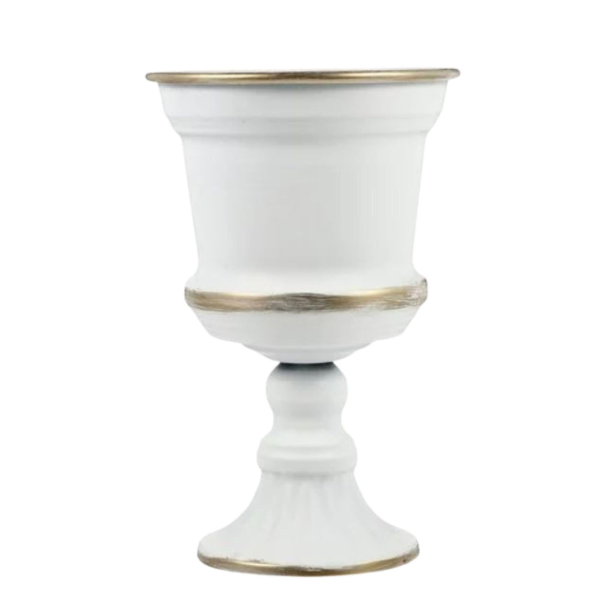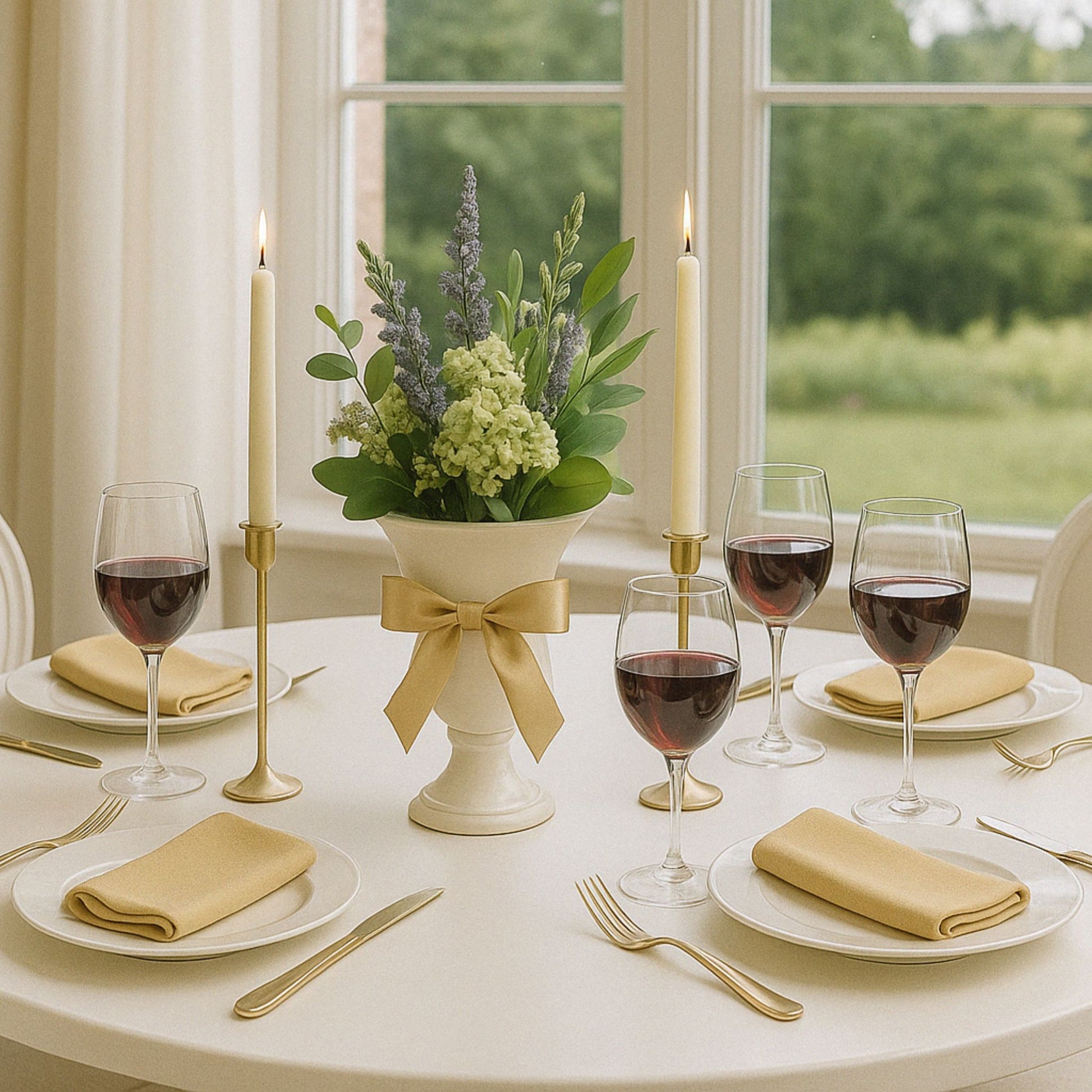 Classy white urn with gold gracefully filled with an arrangement of faux flowers that mimic nature’s finest blooms. The beauty of artificial florals is that they remain lush and pristine, allowing you to design a centerpiece that stays stunning throughout the occasion.