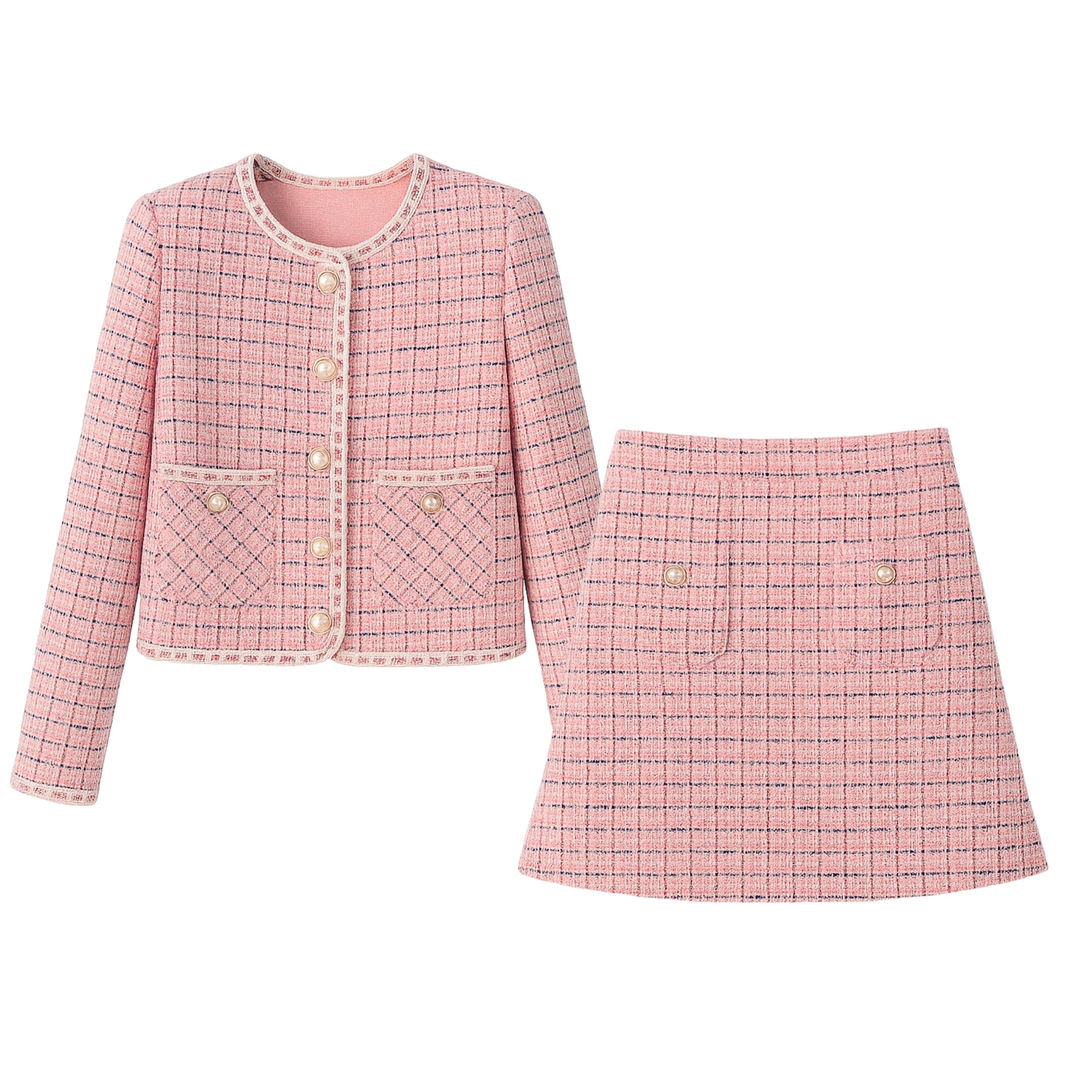 Tweed meets classic tailoring in this beautifully coordinated blush two-piece set. The jacket features pearl-trim buttons, a clean round neckline, and front pockets outlined with delicate detailing for a refined finish. The matching skirt follows with a flattering straight silhouette and the same textured tweed weave that gives the outfit its elegant structure. Worn together, the set creates a polished, feminine look perfect for work, events, or elevated everyday style.