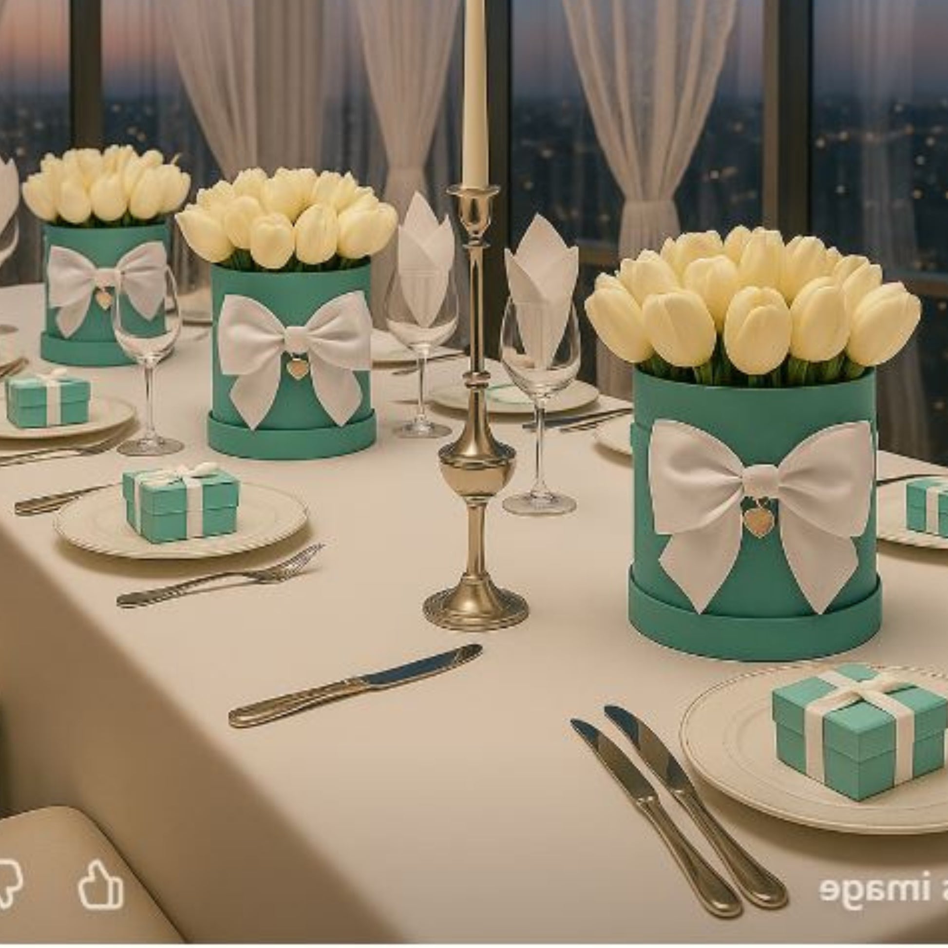 Introducing our exquisite Tiffany-inspired Wedding Flower Box Table Decoration.  The flower box features a stunning arrangement of high-quality, lifelike artificial tulips in the iconic Tiffany blue hue.