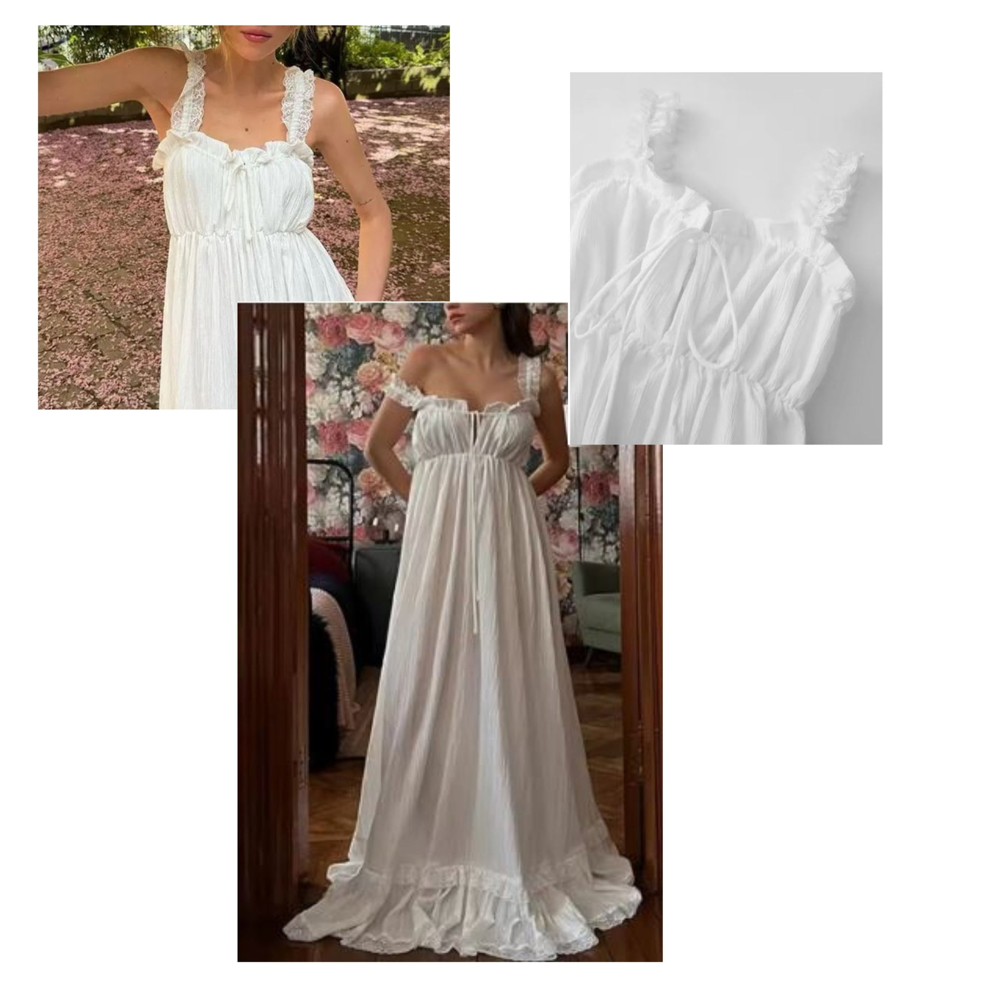 Dreamy white maxi dress blends timeless romance with effortless elegance. Crafted from a soft cotton-polyester blend, it features delicate lace-trimmed shoulder straps and a ruffled hem that sweeps gracefully at the floor. The gathered bust and adjustable drawstring detail offer a flattering, flexible fit, while the lightweight fabric drapes beautifully for warm weather wear. Perfect for summer evenings, garden parties, or bridal showers, this dress radiates a graceful, ethereal charm.